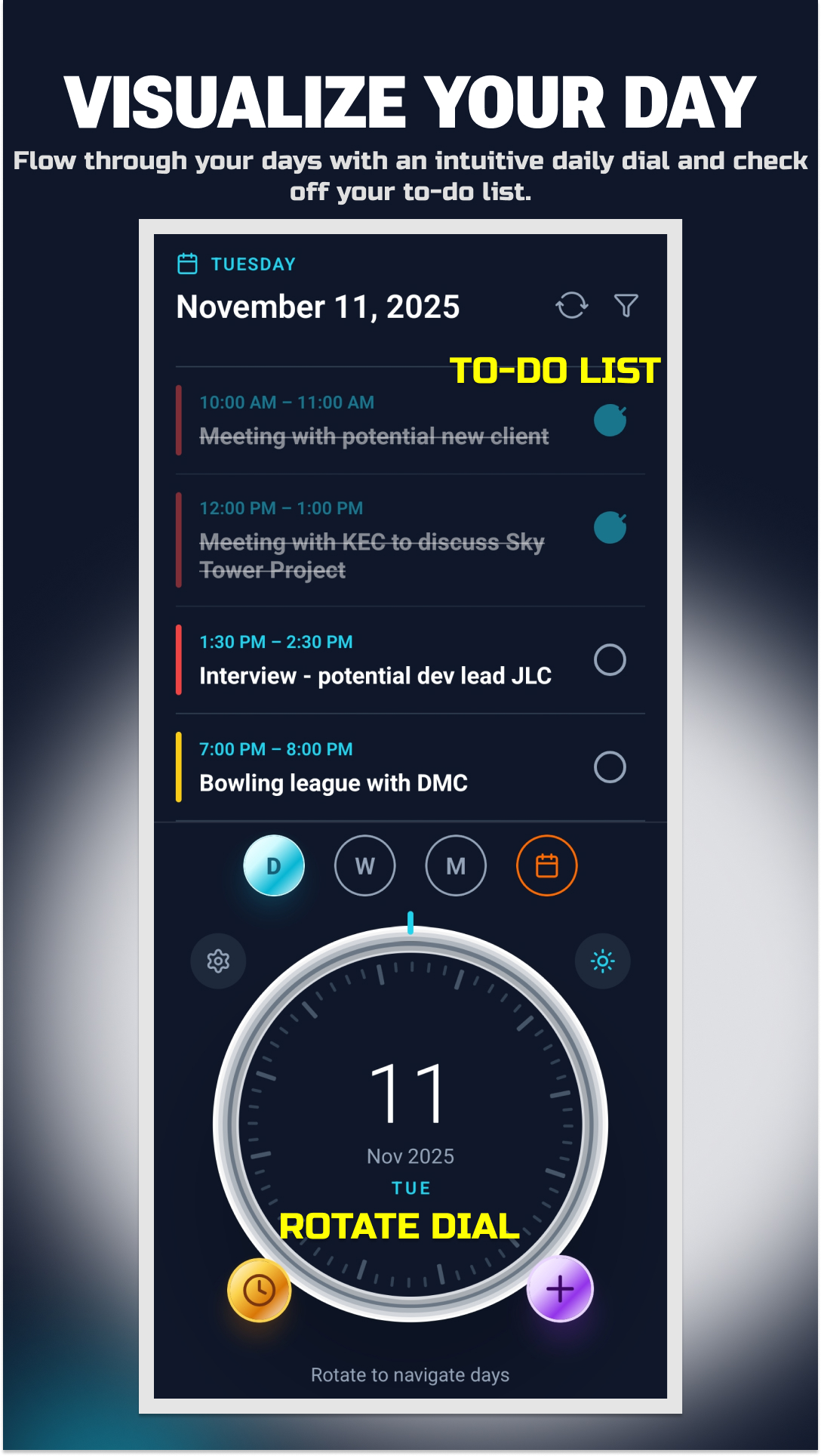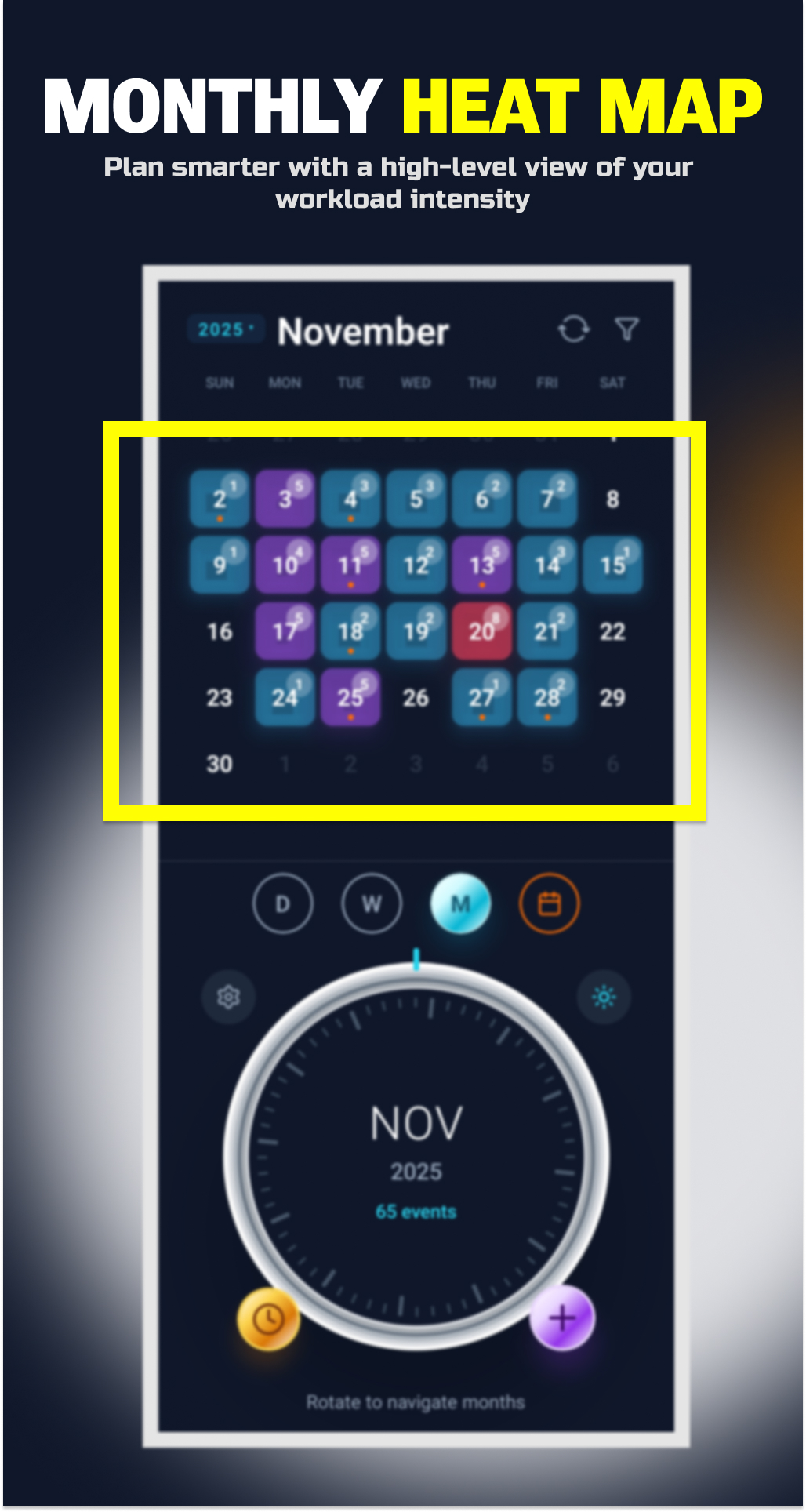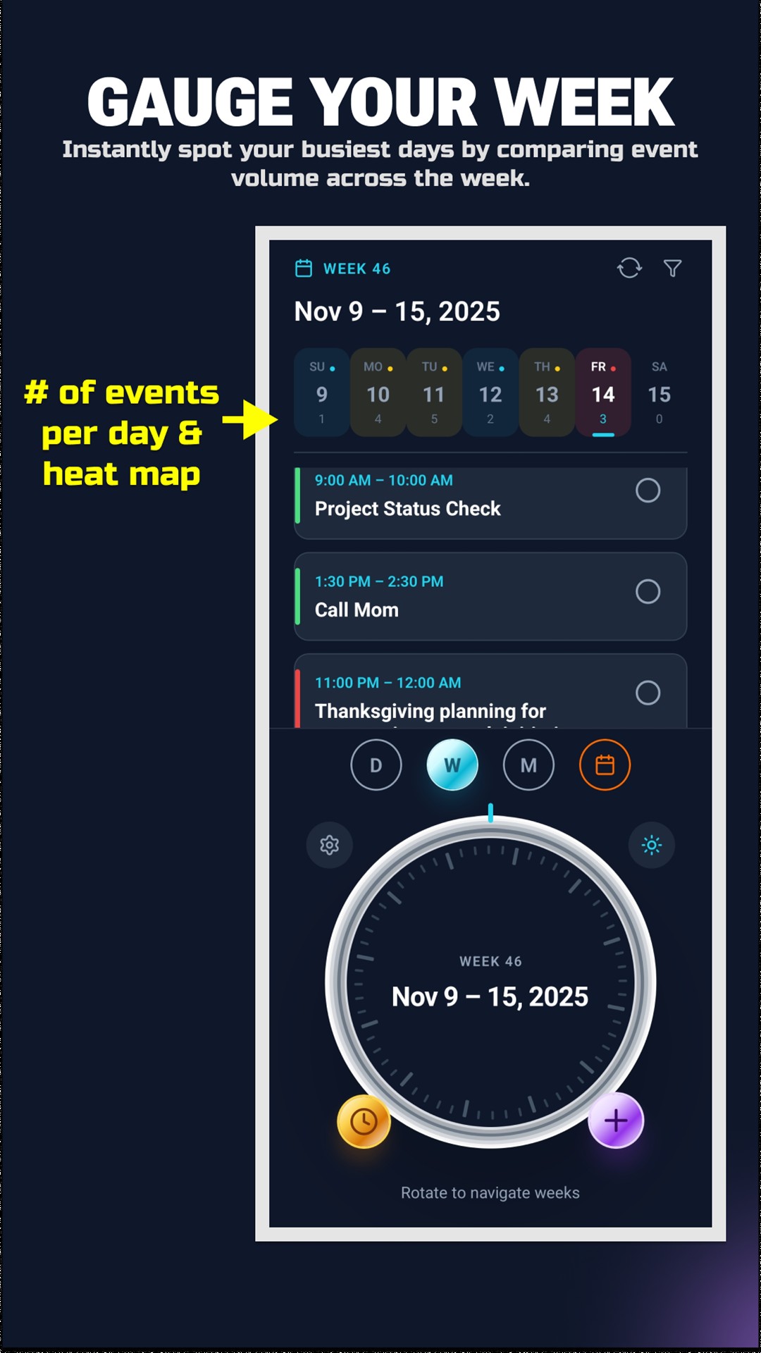 Traditional calendars hide your schedule behind a tap. HaeLeo replaces static grids with a fluid dial—letting you scan, visualize, and flow through your days instantly.