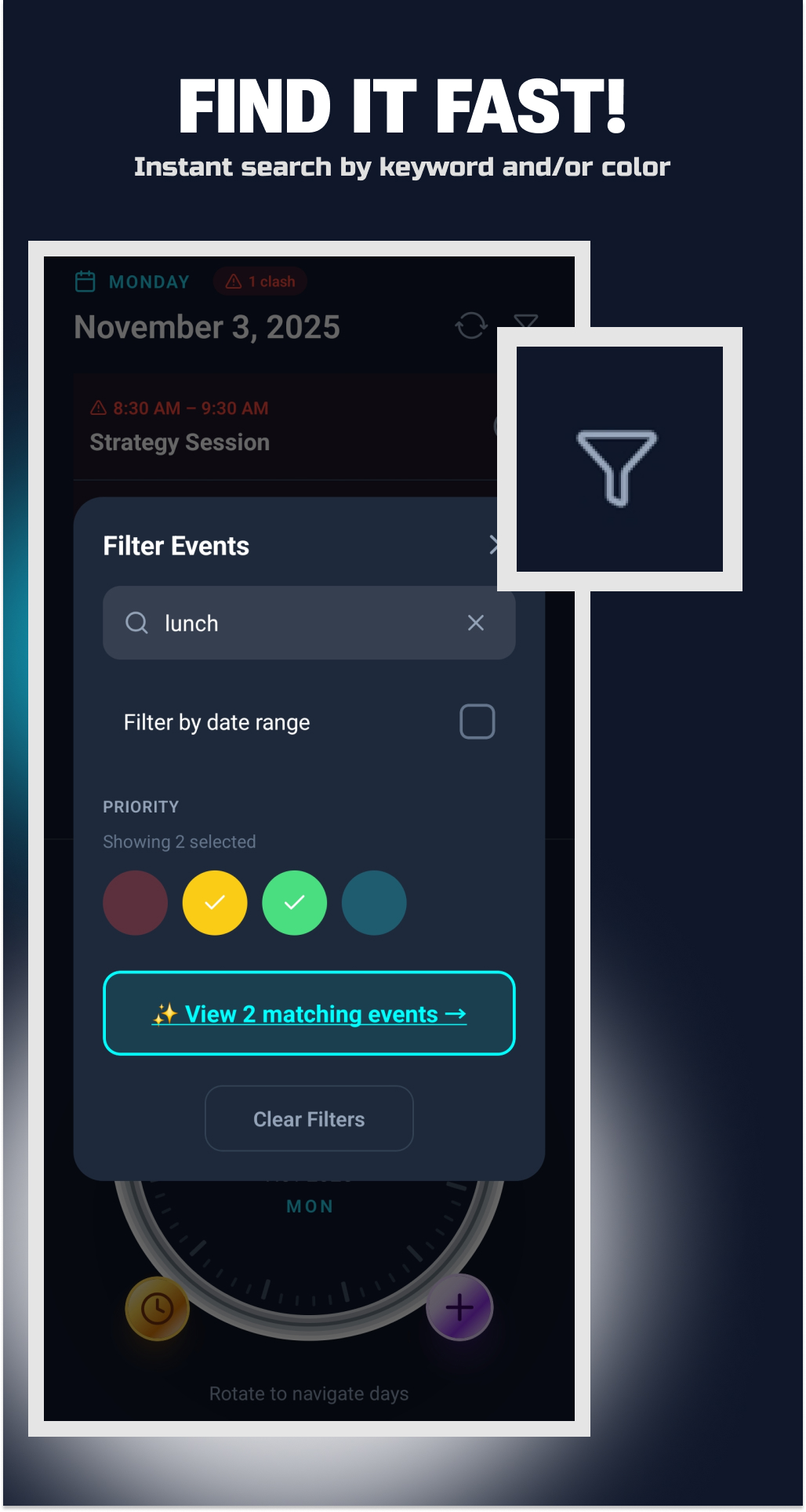 HaeLeo Time Dial syncs instantly with the calendar already on your phone. No setup, no accounts, no data leaves your device.